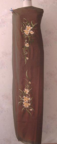 生地は化繊のシースルーの生地です。生地は手刺繍のものと変わりません。少し柔らかめの生地です。こちらの裏地は、もともと生地に付属している、化繊の裏地になります。(他の色のシルクの裏地指定可能です)