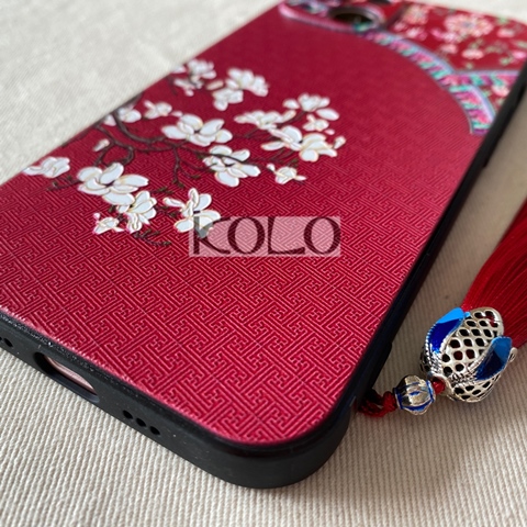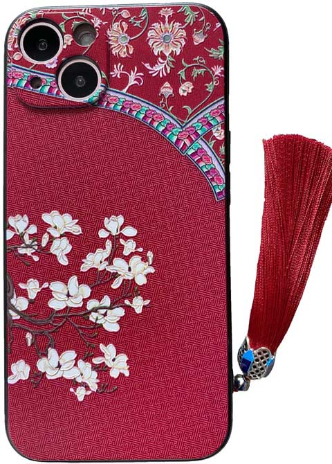 - ワインレッドにハクモクレン模様で、全体は宮廷服になっています。ワインレッドの部分は、雷紋柄の地紋です。
